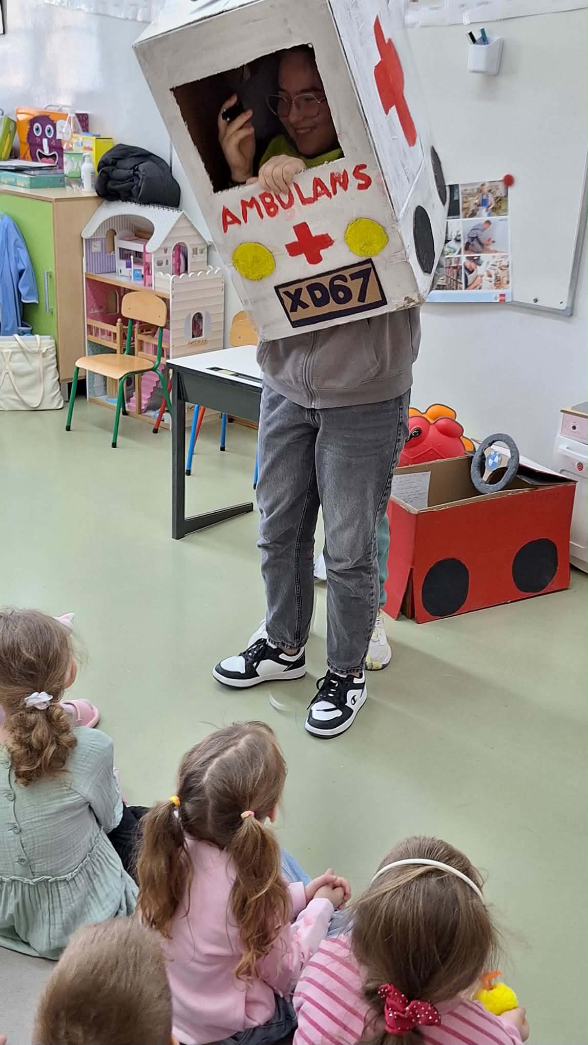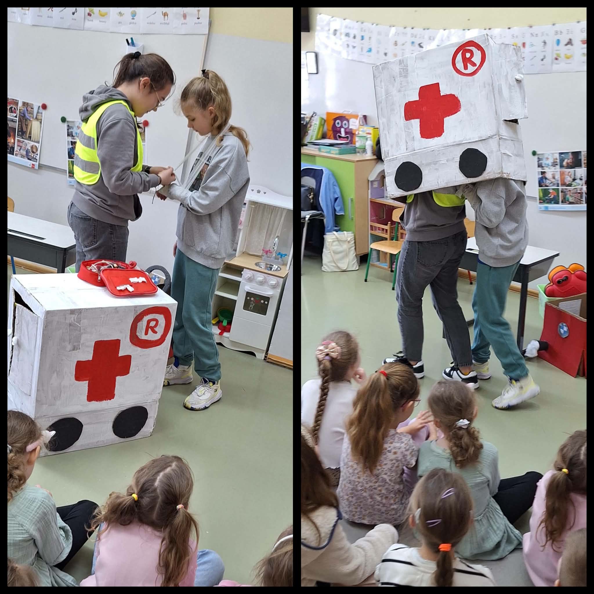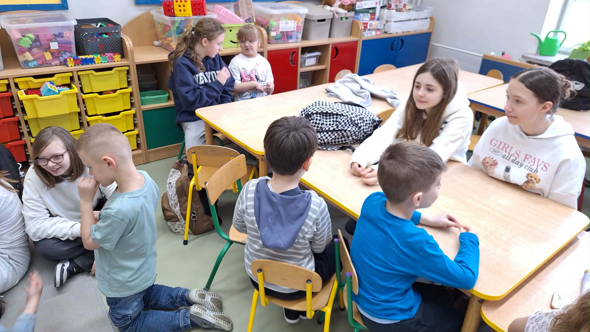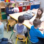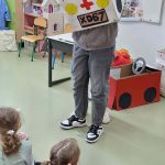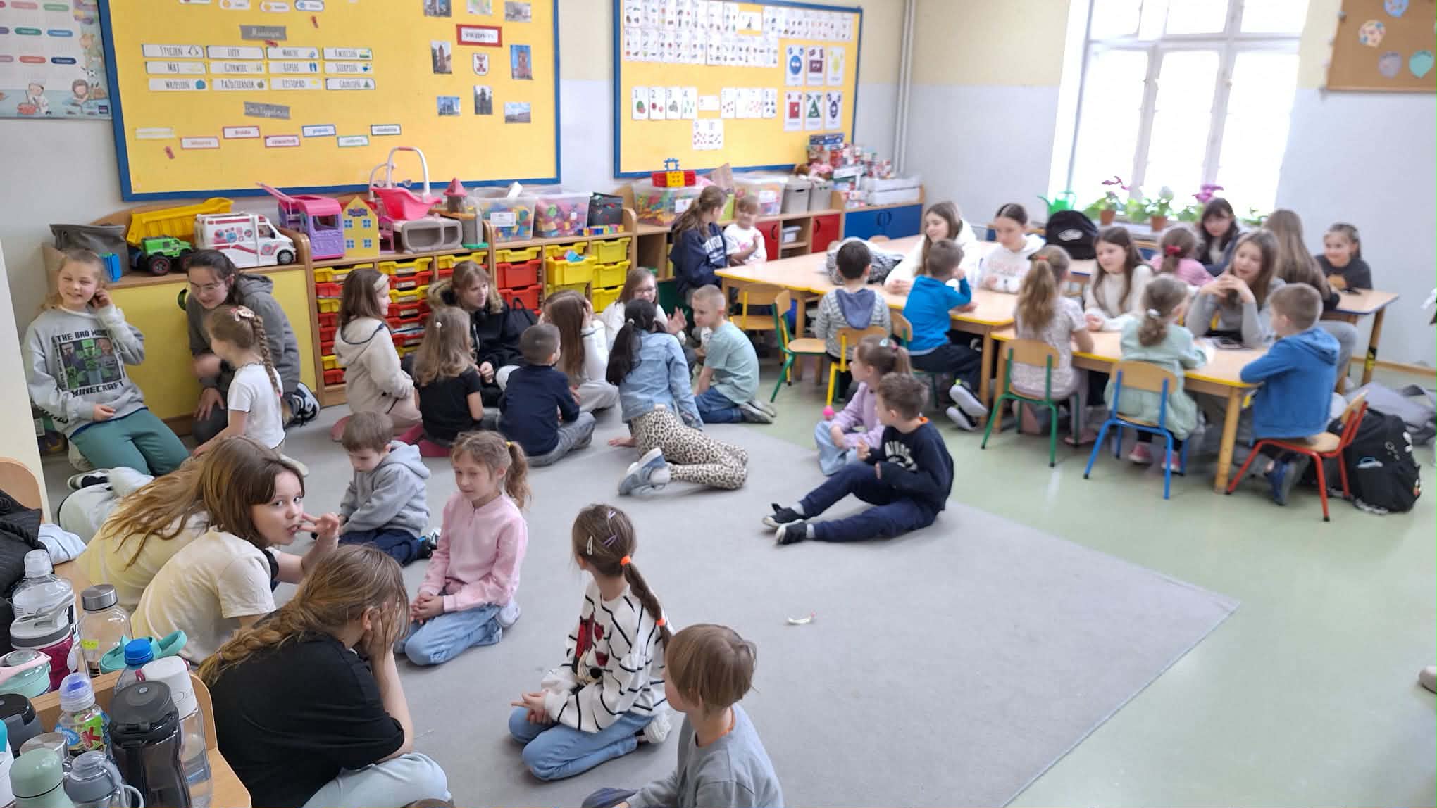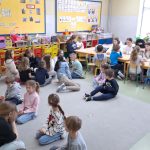 Podczas ostatnich zajęć języka angielskiego, zerówkowiczów odwiedziły uczennice z klasy 6b, które przygotowały krótkie scenki w języku angielskim. Dotyczyły one sytuacji, w których ktoś potrzebuje pomocy lub wizyty u lekarza. Szóstoklasistki zaprezentowały w ciekawy sposób, jak po angielsku poprosić o pomoc czy powiedzieć, że źle się czuje. Na zakończenie zajęć zerówkowicze mieli okazję porozmawiać ze starszymi koleżankami w języku angielskim. Ćwiczyli proste zwroty, przedstawiali się i zadawali pytania. Spotkanie było ciekawą lekcją języka angielskiego, a jednocześnie okazją do współpracy i integracji między uczniami różnych klas.
