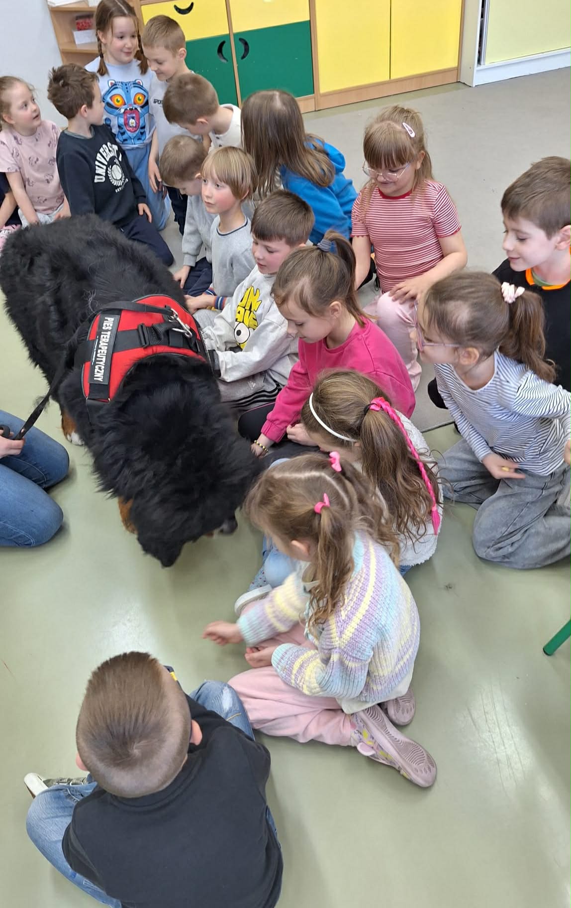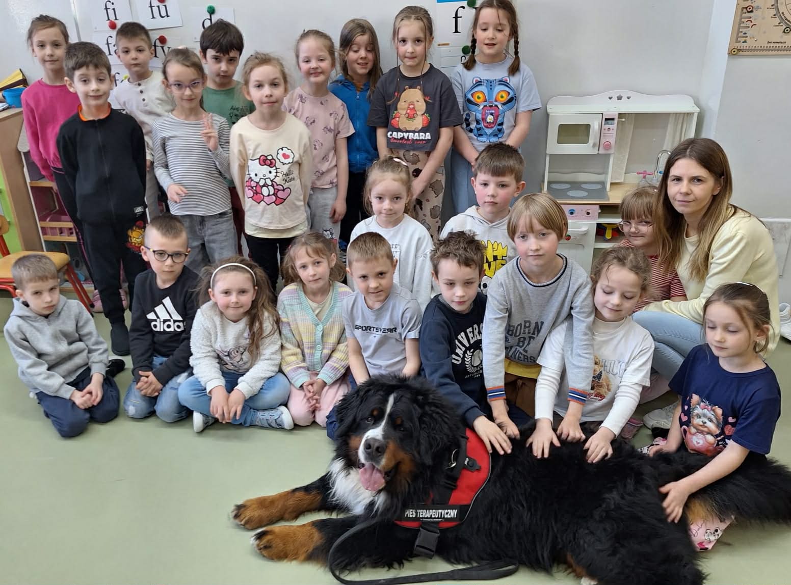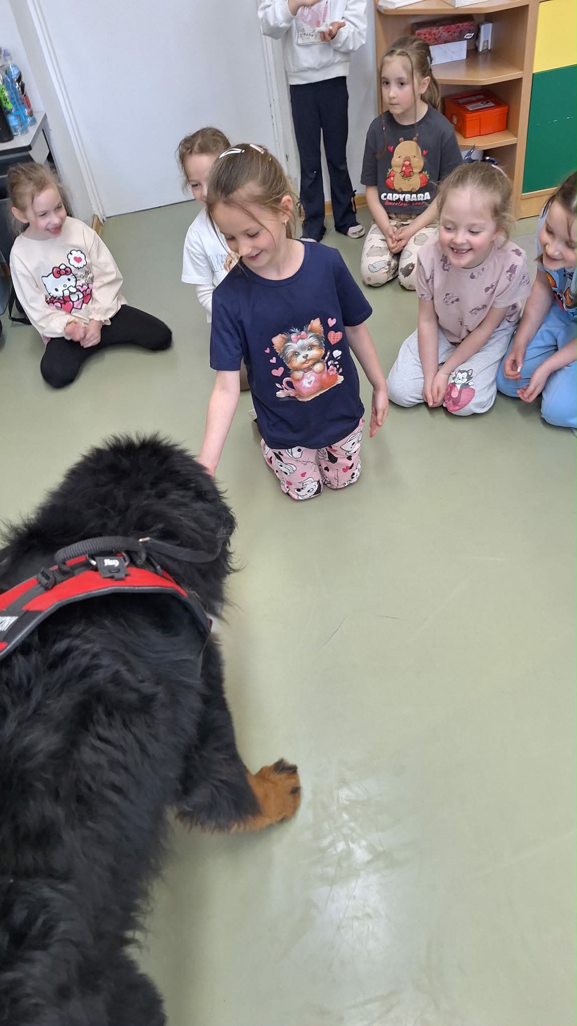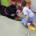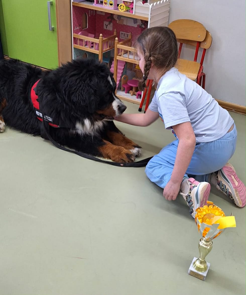 W grupie 0b odbyły się zajęcia z dogoterapii. Odwiedziła nas Pani Joanna ze swoim psem. Uczniowie dowiedzieli się na czym polega dogoterapia, a także mieli okazję do bezpośredniego kontaktu z psem. Spotkanie sprawiło wszystkim dużo radości i było wartościowym doświadczeniem.