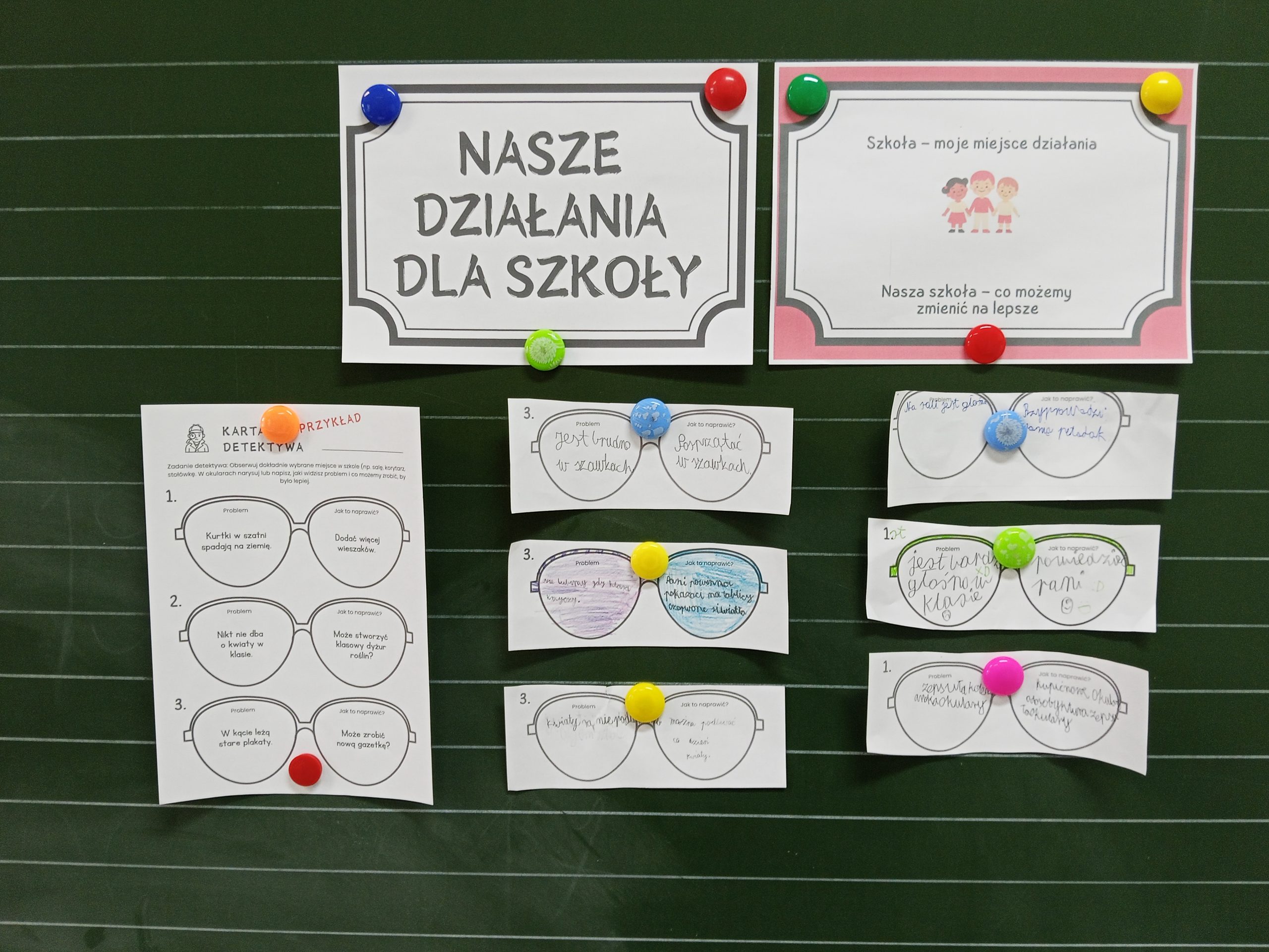 Uczniowie rozwijali postawy obywatelskie i poczucie odpowiedzialności za wspólną przestrzeń poprzez działanie na rzecz klasy i swojej społeczności. Otrzymali Karty detektywa z okularami pomysłów i współpracowali w zespołach, skupiając się na wybranym problemie. Następnie opracowali plan naprawy. Dzieci świetnie sobie poradziły z tym zadaniem, proponując pozytywne zmiany.